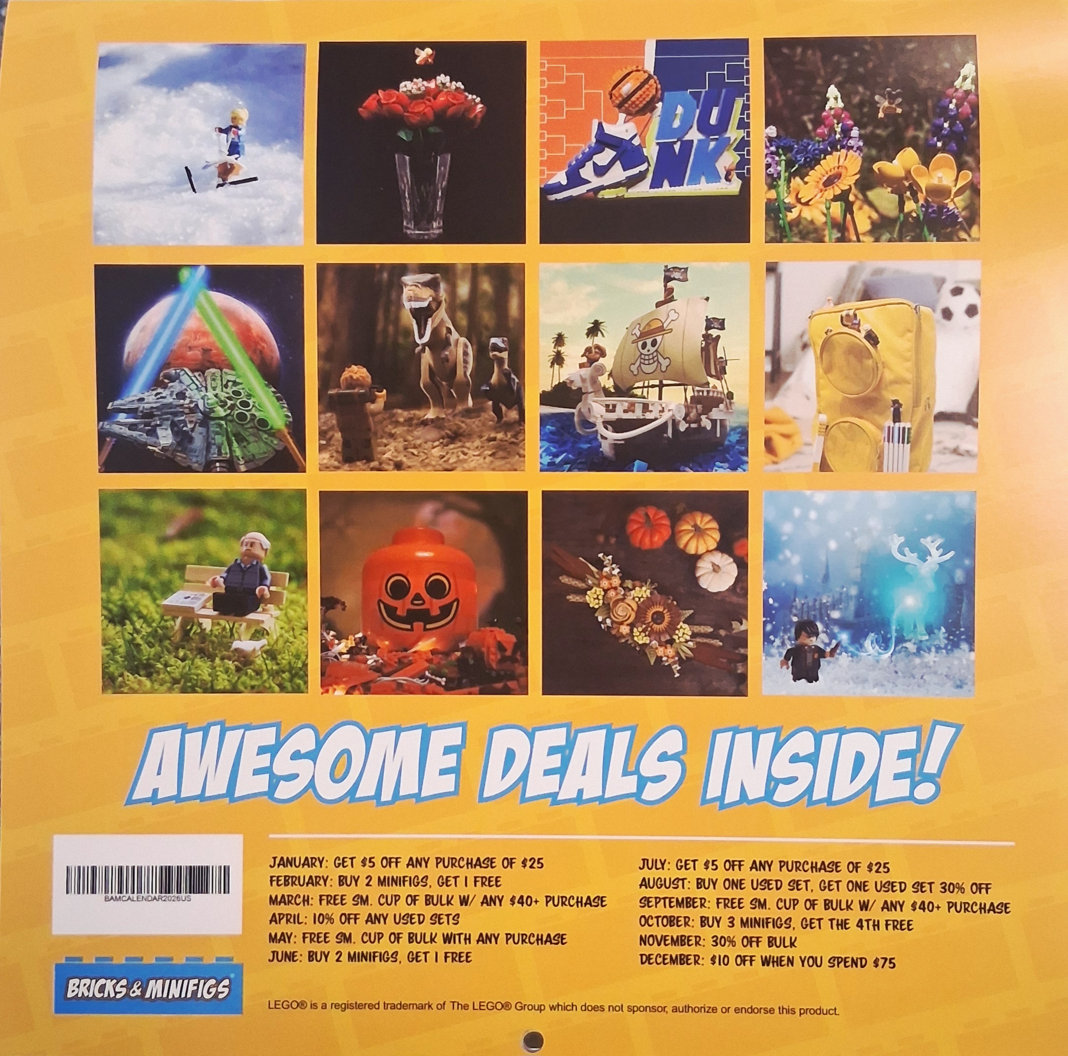 Come in and purchase your 2026 Bricks and Minifigs Calendars for $20! Filled with monthly events, discounts and coupons!