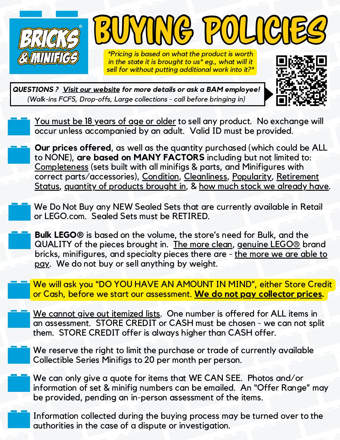 – Have a LARGE LEGO® collection you want to sell?: We ask that you CALL or EMAIL us BEFORE you attempt to bring in your large LEGO® collection to the store. This way both customer and store staff have an understanding of how best to proceed and we are considerate of everyone’s time.