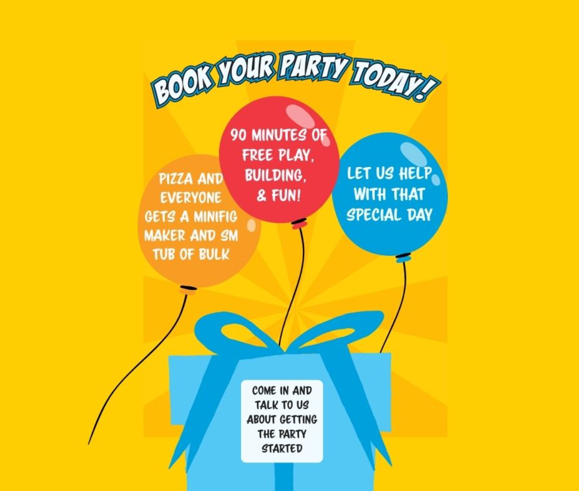 Each participant will receive coupons for a minifig maker and small tub of bulk to be used anytime after the party (can be a separate day).