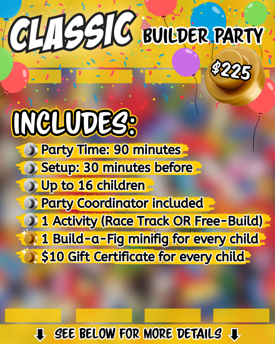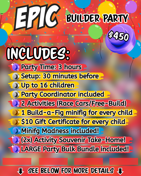 • Minifigure Madness – The birthday child receives a gift certificate for $30 worth of minifigures on the day of the party