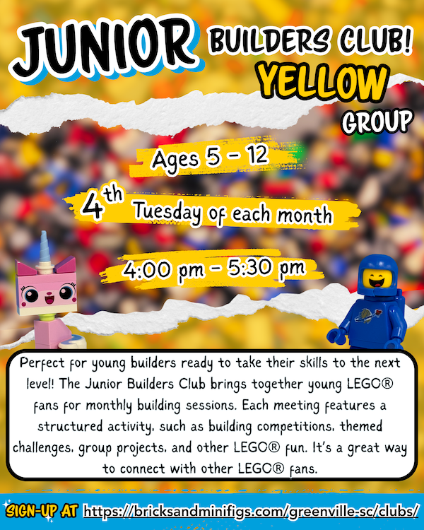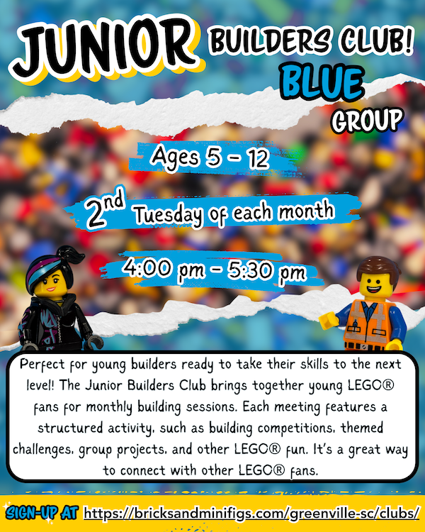 Perfect for young builders ready to take their skills to the next level! The Junior Builders Club brings together young LEGO® fans for monthly building sessions. Each meeting features a structured activity, such as building competitions, themed challenges, group projects, and other LEGO® fun. It’s a great way to connect with other LEGO® fans.