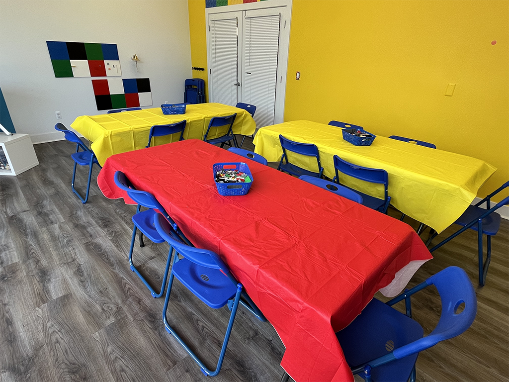 - Party room bulk table filled with LEGO® to build race cars to race on the custom Derby track.