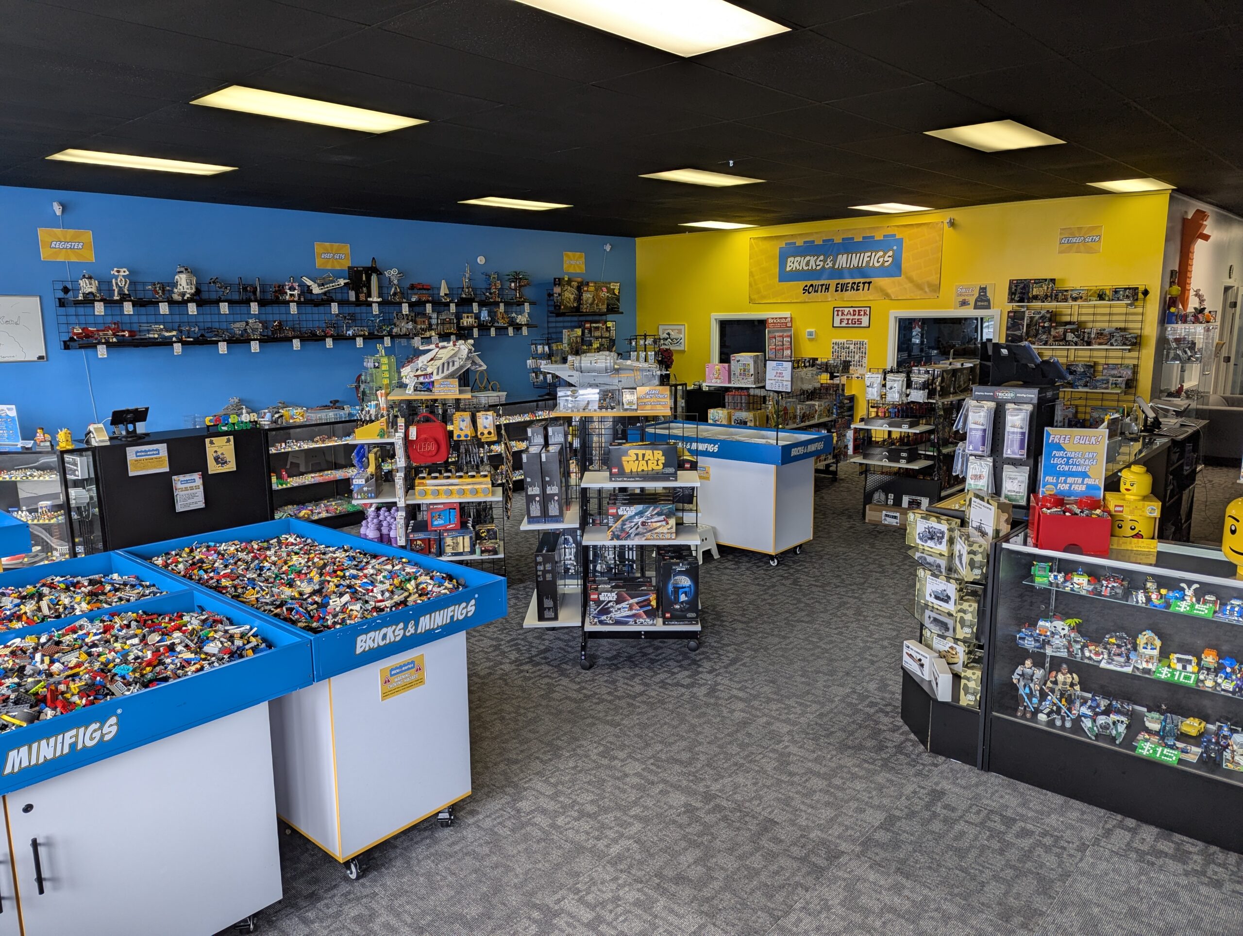 Our motto at Bricks & Minifigs South Everett is “rebuild, reuse and reimagine.” That is reflected in everything we do at our store, including what you will experience as a customer! Come to our stores to find new sets as well as retired LEGO sets and bulk LEGO pieces. Have LEGO sets or bulk you want to find a new home? Come to Bricks & minifigs South Everett to sell or trade your old collections!