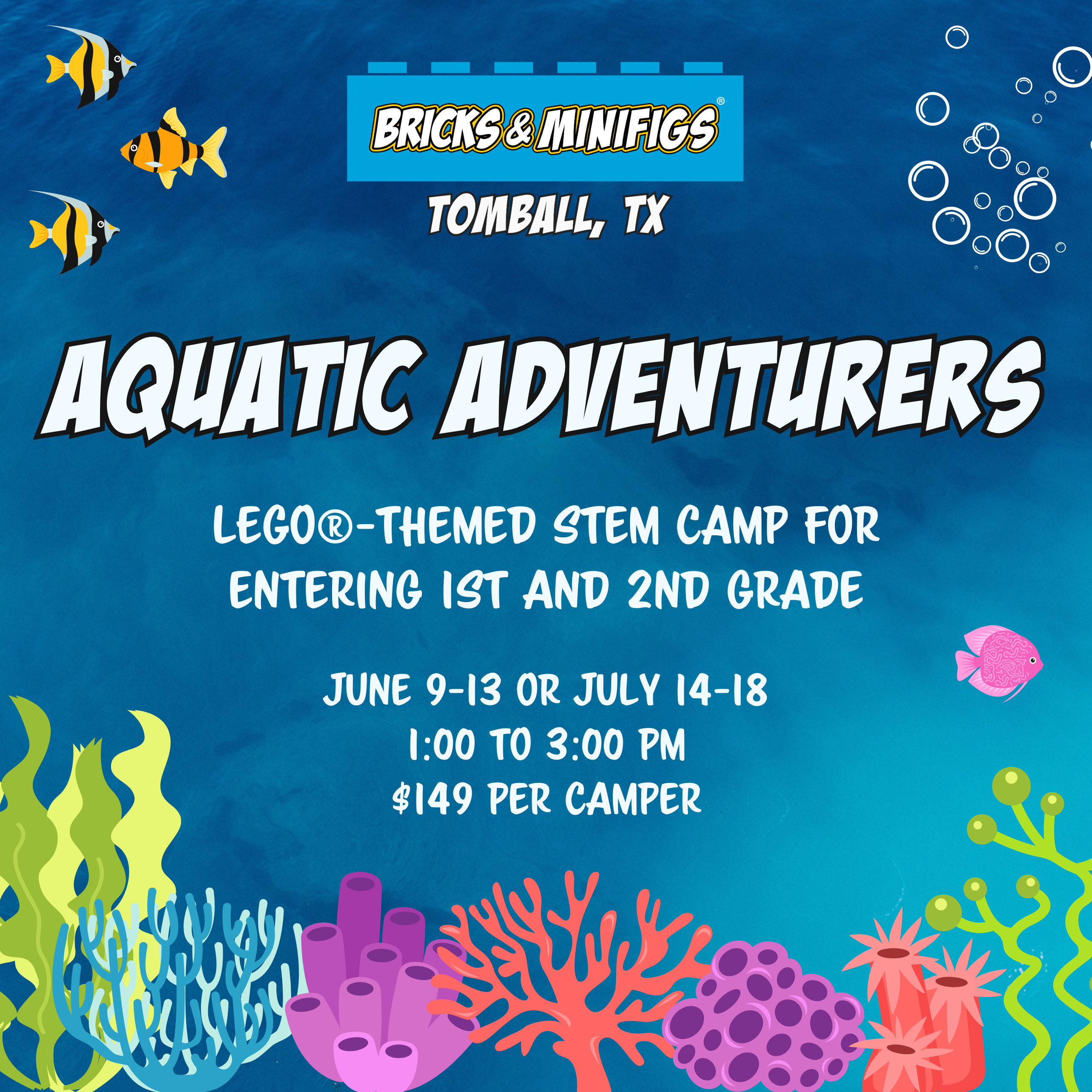 Dive into creativity through our Aquatic Adventurers LEGO®-themed summer camp! We’re providing a hands-on experience for kids entering 1st through 2nd grade to explore the wonders of the deep sea—one LEGO brick at a time.
