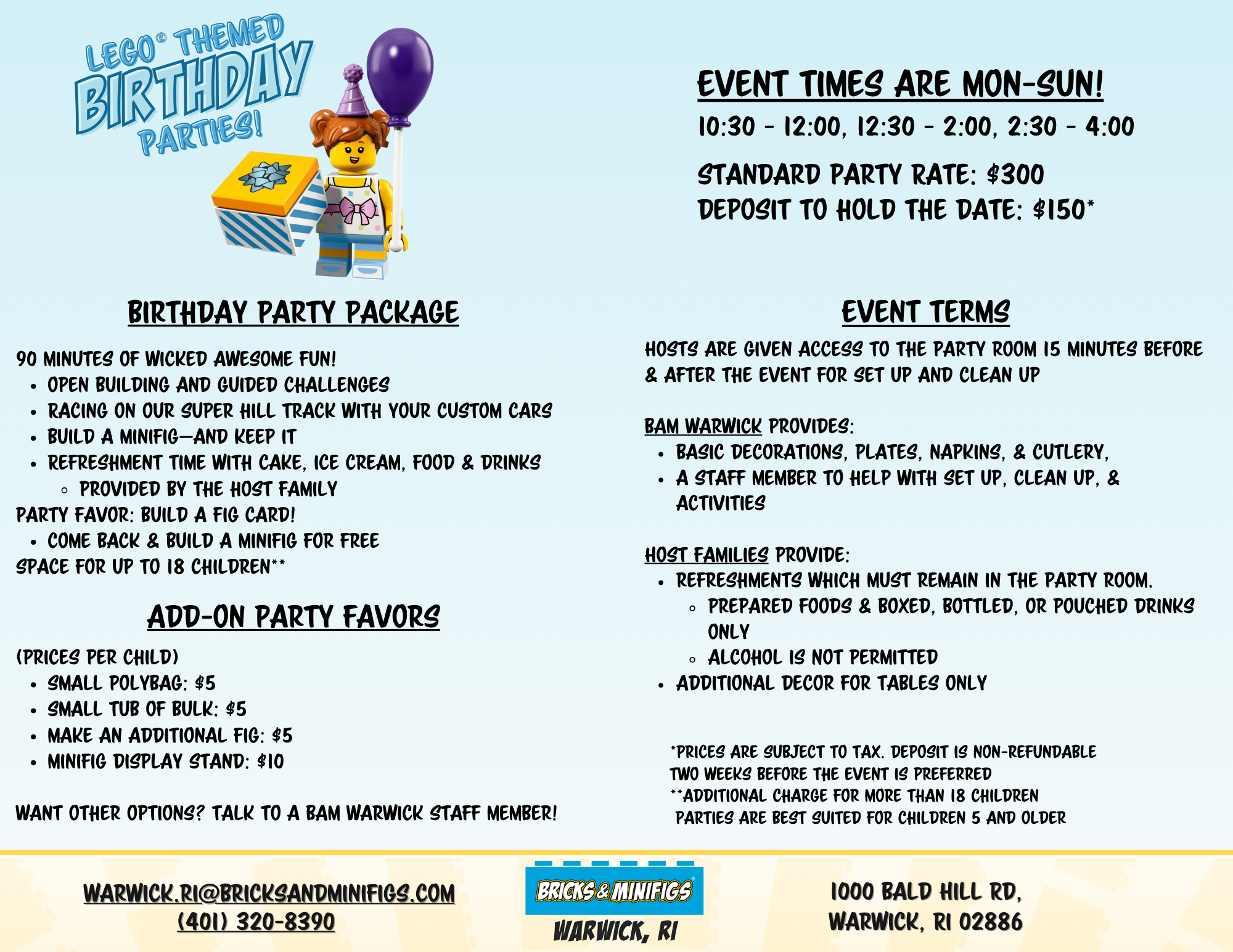 Please call (401) 320-8390 or email warwick.ri@bricksandminifigs.com for availability and details.